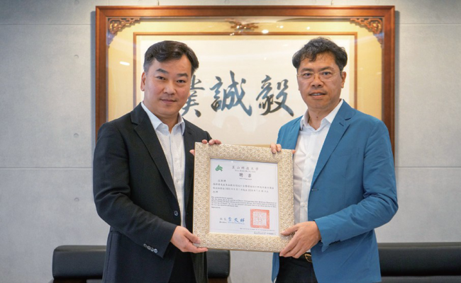 ▲國際知名建築設計師羅耕甫( 右) 獲聘崑山科大講座教授,李天祥校長親頒聘書。