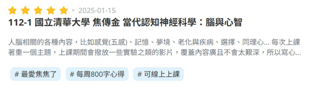 在歐趴糖,我們極力確保所有評價的真實性。每一條評價都來自實際上過課的大學生,他們用自己的經驗和感受,為後來的學弟妹提供寶貴的第一手資訊。這不僅讓您避免陷入不適合自己的課程,更能讓您事先對課程有更全面的了解。