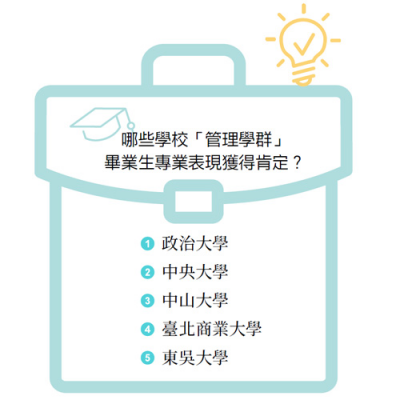 管理學群畢業生專業表現最受歡迎的學校排行中,由老牌國立大學「國立政治大學」穩居榜首。國立政治大學以求管理紮根、促進企業升級,育才多年,歷屆校友在各行各業表現傑出在企業界聲譽日隆;第二名由「國立中央大學」榮獲,中央大學的ERP教學居全國領先地位,近幾年積極提供學生校外實習與國際交流,開展學生視野,畢業校友表現深獲企業肯定;第三名由「國立中山大學」榮獲,致力造就國內企業界中高階層管理人才培育,打造學術與經貿發展相結合的樞紐,成為南區企業人才培育基地;第四名由「國立臺北商業大學」榮獲,學校主打創新與產業務實結合,近年將行銷與流通訂為系科發展特色,畢業校友在業界表現亮眼;第五名由私校老牌大學「東吳大學」榮獲,成為唯一一家上榜的私立大學,東吳大學是台灣私立大學最早成立的企管學系,培育的系友已超過萬名,致力培養社會所需的卓越管理人才,深獲企業親睞。■