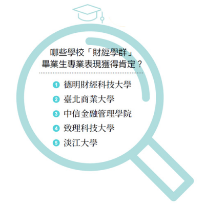 財經學群畢業生專業表現最受歡迎的學校排行中,科技院校老牌學校「德明財經科技大學」首度打敗國立大學拔得頭籌,德明財經科技大學主打培育就業人才,長年與多家金融機構進行實習合作,讓學生在學期間就能做中學,即早累積就業競爭力,深受企業肯定;第二名以「臺北商業大學」榮獲,台北商業大學為臺灣歷史上第一所商業學校的百年老校,孕育無數英才;第三名由「中信金融管理學院」榮獲,致力打造國際金融學習基地,推廣海外實習,也廣招海外金融人才來台交流;第四名由「致理科技大學」榮獲,學校務實推廣學用合一,積極與產業合作,近期並致力於金融科技創新實務雲端發展,學生專業表業,獲企業支持;第五名由「淡江大學」榮獲,淡江大學畢業校友深耕銀行金融相關產業服務,工作表現多為業界所肯定。■