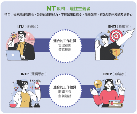具有直覺(N)和思考(T)特質的你,具備抽象思維與理性、冷靜的處理能力。例如, INTJ /ENTJ 因為擅長長遠規劃和決策,適合管理顧問和策略規劃領域的工作; INTP / ENTP 則以強大的邏輯分析能力和創新思維,適合軟體開發和創新設計工作。