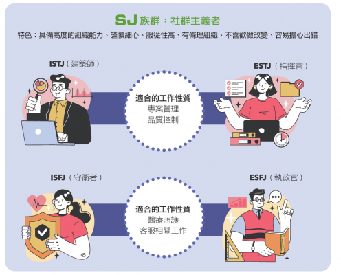 具備感覺(S)和判斷(J)特質的你,善於在結構穩定的環境中工作,並具備高度的組織能力。ISTJ / ESTJ 適合專案管理和品質控制工作; ISFJ /ESFJ 則擅長醫療照護和客服相關工作。