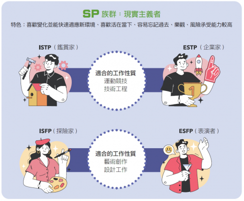 具備感覺(S)和知覺(P)特質的你,喜歡變化並能快速適應新環境。ISTP / ESTP 適合運動競技和技術工程;ISFP / ESFP 則特別適合從事藝術創作和設計工作。
