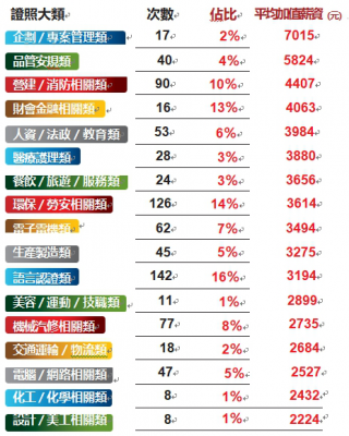 另外,根據1111人力銀行與國立清華大學決策分析研究室所研究的「加值能力分析」中,針對各種證照對職務人才的薪資增幅程度進行分析, 912種對特定職務達顯著差異的值錢證照中,就有16%是屬於語言認證類證照, 是最多的證照類別,但若以薪資增幅來看,語言認證類證照平均加值薪資約3194元/月,在各類別證照中大約在中間。雖然因為語言相關證照普及程度較高,擁有人數較多,更有許多企業把語言能力視為招募新人門檻而非加薪的重要依據。但無論如何,語言證照對於薪資成長的幫助應該是無庸置疑的,擁有良好的外語能力,再加上證照的背書,將能使你在競爭愈趨激烈的全球化時代中,為未來的發展性鑲上一層金。