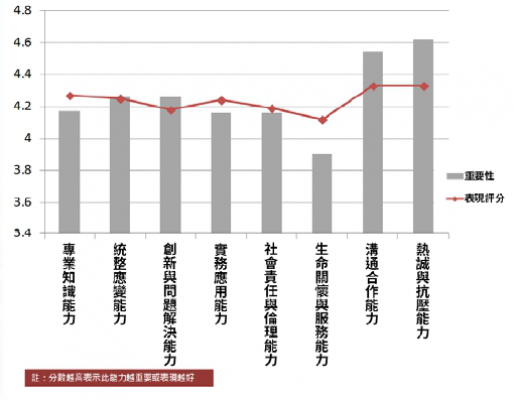 詢問受訪企業在招募面試時評估用人的標準與表現如何?調查結果以「熱誠與抗壓能力」重要性最高,其次則為「溝通合作能力」,也是與新人平均表現差異較大的地方,若學校能在此部分多加以培訓,便能更符合企業界之期待。