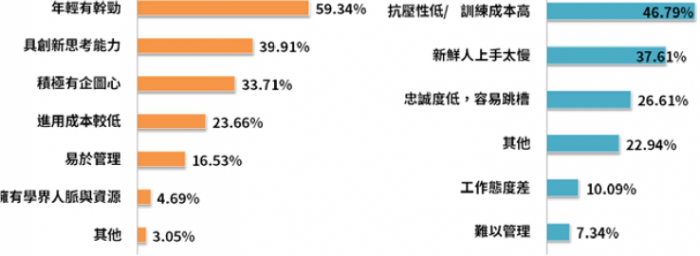 調查受訪企業對於大學「新鮮人」的聘僱意願,願意為95.13%,不願意為4.87%,接受程度相當高,其中願意的原因主要以「年輕有幹勁」、「具創新思考能力」為多,而不願意雇用的原因則以「抗壓性低/訓練成本高」、「新鮮人上手太慢」的比例較高,可見雖然新鮮人薪資較低,但相對地需要付出教育訓練的成本高、無法立即上崗,若學校所學能與產業需求結合更緊密,或許能改善新鮮人的就業環境。