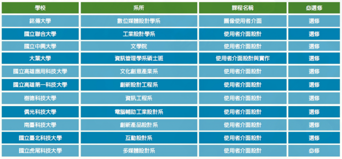 大家也可以上「大學院校課程資源網」(ucourse-tvc.yuntech.edu.tw)查詢想上的課哪些校系有開。以「使用者介面(UI)設計」課程為例,105學年上學期共有以下校系有開設: