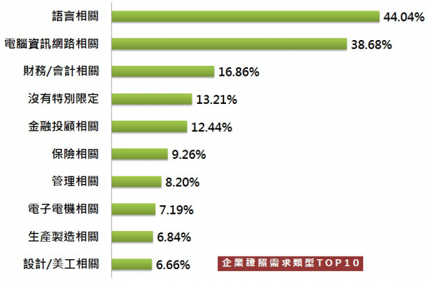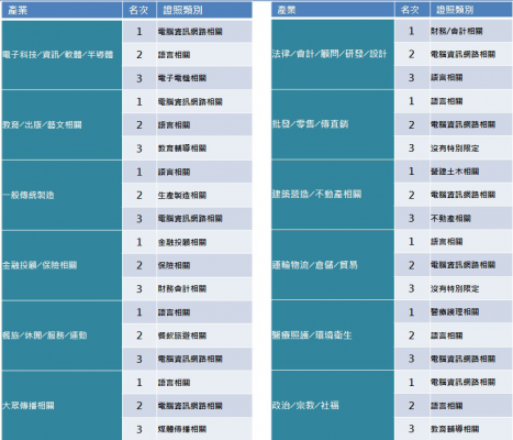 隨著求職性質不同,考取的證照也不盡相同,觀察企業證照需求類型TOP10與產業證照需求,無論是何種產業,「語言相關」證照幾乎榜上有名,顯示新鮮人除了要有專業能力,還必須再加上英文能力,才能具備完整的國際競爭力。另外,因應科技在各行各業的廣泛應用,電腦資訊網路相關證照也相當重要,準備好「數位力」,為職涯加值。