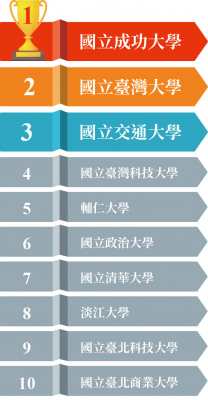 在國立一般大學的排名中,成大排名上升,成為企業主心目中最愛的國立大學,臺大下滑一名,與成大排名互換,抱走亞軍。擁有併校利多的國立交通大學,未來可望在「BioICT(生醫電資訊)」與「智慧醫療」提升產業競爭力,名次大幅上升2名。