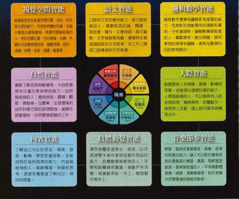 過往評定一個人的能力,嚐過度偏向單一類型的智力測驗,這僅能稍微預測學生的在校成績,但卻無法預測他們未來在各領域的傑出成就。美國哈佛大學教授於1983年提出多元智能理論,拋棄過去對智力過度狹窄的定義,而以多元智能組合來描述一個人的獨特天賦,八種多元智能如下: