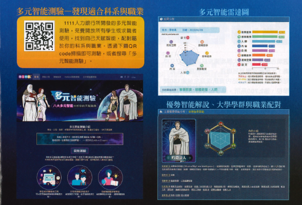 也許有人會問,萬一我喜歡做的,卻不是很擅長,或是擅長的領域,沒有很深的興趣,又該怎麼辦呢?那麼,針對「興趣」羽「能力」去做綜合性權衡,將會是最好答案。1111人力銀行開發的「HOLLAND興趣測驗」和「多元智能測驗」,就如同兩面不同的指路牌,若兩者方向一致自然最好,兼顧興趣和能力是最棒的選擇。但假如兩個指路牌指引不同方向,需要從興趣與能力中做取捨。那我們只要能深入瞭解,兩個路牌所指引的最終目的地 : 「科系」和「職業」?藉由科系與職業的研究探索,你心目中的答案自然會慢慢浮現囉 ! 下面將依序介紹「大學網」與「職務大辭典」,為您提供最完整的生涯資訊 !