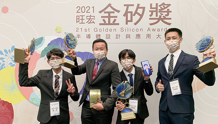 ▲ 南臺科技大學團隊(由左至右) 電機工程系碩士生施傑、施金波助理教授、碩士生柯明峻及校友黃昱誠勇奪「2021旺宏金矽獎–半導體設計與應用大賽」應用組銀獎及應用組最佳創意獎。
