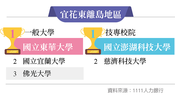 在地區排行中,根據調查顯示,在北北基地區,集頂尖人才於一處的國立臺灣大學依舊穩坐龍頭寶座,其次則是國立政治大學及國立臺灣師範大學位居23名,值得一提的是,今年淡江大學在各家爭鳴中搶進第4名的席位,而在2022美國新聞與世界報導全球最佳大學排名中,淡江大學也勇奪私立大學非醫學類第1名,近期更在AI創智學院實境場域,於企業界中引起討論聲量。輔仁大學則是註冊率高達99.07%,辦學深獲家長與企業肯定。今年新進榜的中國文化大學,在英國QS 2022排名中,也首度進入亞洲500大、臺灣前30大。同樣新進榜的真理大學,經教育部評選,獲頒全國僅8所大專校院得獎的「生命教育特色學校」的殊榮,重視學生各方面均衡發展,也受到企業主的青睞。