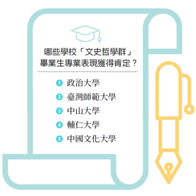 在「2022企業最愛大學」問卷調查,文史哲學群領域排行中,由民國43年在臺復校歷史悠久,以人文社會學科享譽全國的「政治大學」穩居榜首,另在報考高普考行政類科中錄取人數學校排行(大學畢業3年內),也勇奪第一;第二名則由「臺灣師範大學」奪得,臺灣師範大學在人才培育採多元化政策,因應時代潮流積極轉型為綜合大學。除原有師資培育相關系所外,持續增設符合社會變遷並足以引領高等教育發展的新系所。