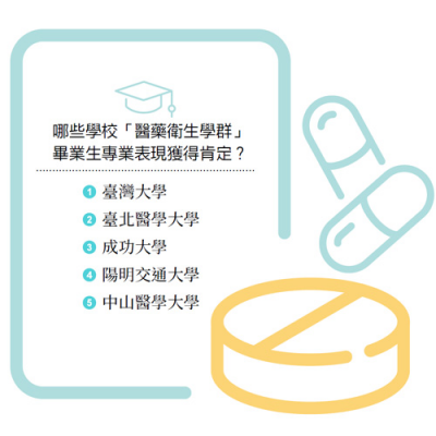 臺大醫學系及陽明交通大學醫學系長年雄踞指考第三類組分數榜的前二名,在各路「學霸」集結下,這兩間學校的醫藥衛生學群表現也十分強勢。在該學群企業最愛學校排名中,分居一、四名。而作為台灣南部醫學重鎮的成功大學,則搶下第三名席次。其他的席次,則是兩間有突破性成長的學校。