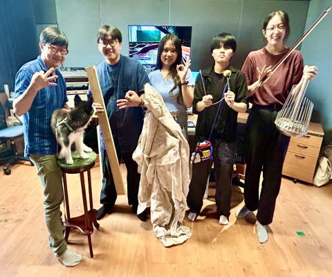 崑大視訊系擬音工作團隊,右起為許韻羯、吳韋姍、楊諭樺、吳尚恩、曹源峰老師。照:崑山科大提供