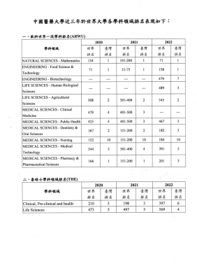 中國醫藥大學近年來在世界大學排名表現亮眼外,各學科領域排名亦名列前茅,2022年於世界大學各學科領域排名表現如下: