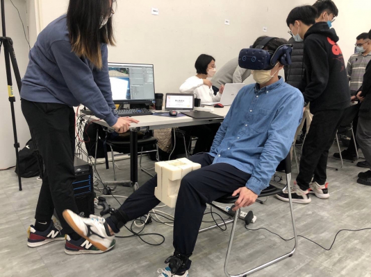 北科大互動系助理教授韓秉軒課程期末展演,邀請校外評審體驗,在學生設計的VR遊戲裡做復健。照:臺北科技大學提供