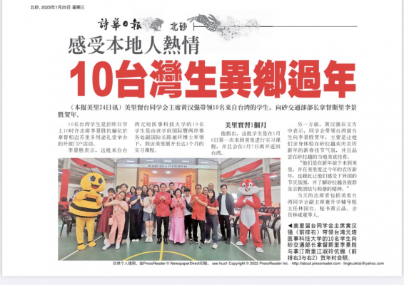 元培護理系10位學生在馬來西亞美里實習期間適逢農曆春節,當地留台學生會主席黃漢強也特地接待他們品嘗當地美食、感受當地春節氣氛,向砂交通部長拿督斯里李景勝伉儷賀年,同學們第一次在海外實習及過年都留下深刻印象。