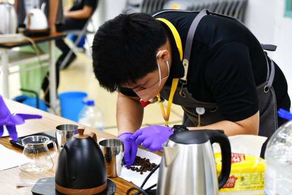嘉義大學咖啡研習社11、12日在蘭潭校區圖書資訊館B1舉辦第五屆覺戰-臺灣全國手沖咖啡交流賽,兩天的活動吸引國內16所大專校院學生共48組隊伍參賽。