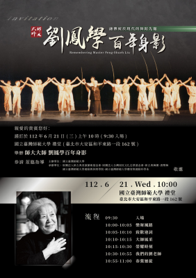 臺灣第一位舞蹈博士劉鳳學上月十七日辭世,享壽98歲。劉鳳學博士生前為臺灣師範大學體育與運動科學系名譽教授,為感念劉教授對舞蹈界的貢獻,臺師大運動與休閒學院、體育與運動科學系,以及財團法人新古典表演藝術基金會、財團法人台灣原民文化志業基金會、新古典舞團、唐樂舞等單位共同籌辦,將於6月21日(三)上午10時在和平校區禮堂,舉行「師大大師 劉鳳學百年身影」活動,邀請社會各界一同緬懷舞蹈界先驅。