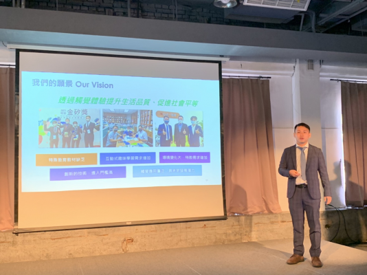 觸覺科技有限公司負責人楊豐憶同學於華山文創園區進行社會企業創業經驗分享之情形。。照:南臺科大提供。