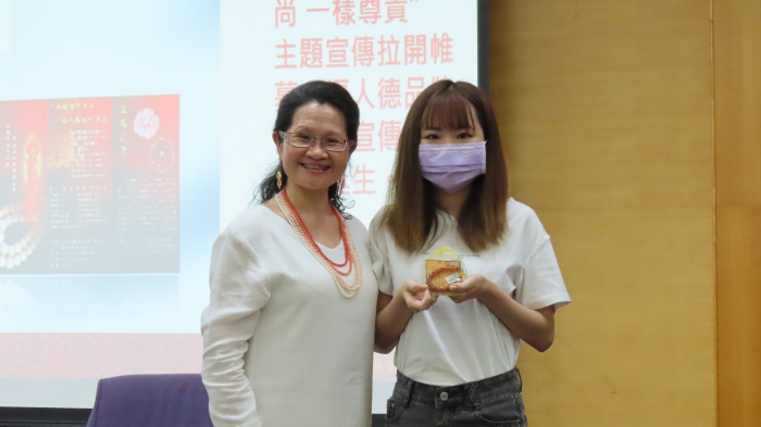 南華大學創業主題班,邀請福人德國際珠寶林金鑾董事長演講,並致贈禮物給現場提問互動的學生。照:南華大學提供