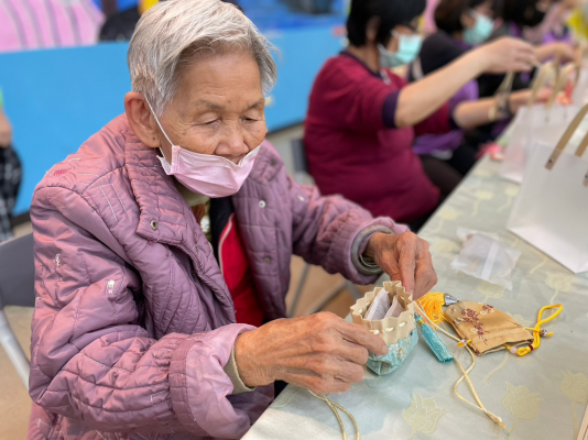 嘉大攜手長青園長輩以新飲食文化歡「馨」迎新年,教導長者認識香草植物及利用,製作香草包吊飾。照:嘉義大學提供