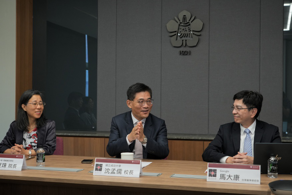 左起、電機資訊學院院長詹寶珠、沈孟儒校長、Google 臺灣董事總經理馬大康博士,一致認為應持續深化彼此夥伴關係。照:成功大學提供