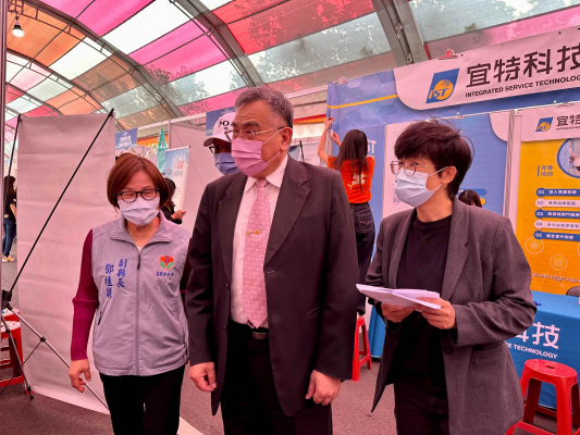 聯大李偉賢校長(中)、吳翠松學務長(右)陪同苗栗縣鄧桂菊副縣長參觀各廠商並致意。照:國立聯合大學提供