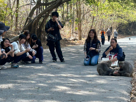去年底高醫大人文社會科學院與日本人間環境大學總合心理學部簽訂學生交流備忘錄(MoU)。今年疫情趨緩後,日本人間環境大學搭上2023年3月的高雄醫學大學國際交流月系列活動,選派綜合心理學系5名交換生至高醫大進行為期3周的訪問學習。此次訪問交流,由高醫大心理學系櫻井正二郎副教授策劃,帶日本交換生實地到柴山觀察生態及獼猴群。上山前,櫻井副教授先請高醫大生物系陳炤杰副教授介紹台灣環境與生態;櫻井副教授則運用專業,用比較心理學觀點來解說包括獼猴之靈長類的行為比較,讓學生在上山前能做好準備作業。