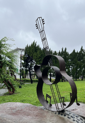 豎立在淡江大學牧羊草坪上的民歌意象雕塑,鼓勵淡江人「唱自己的歌」。照:淡江大學提供