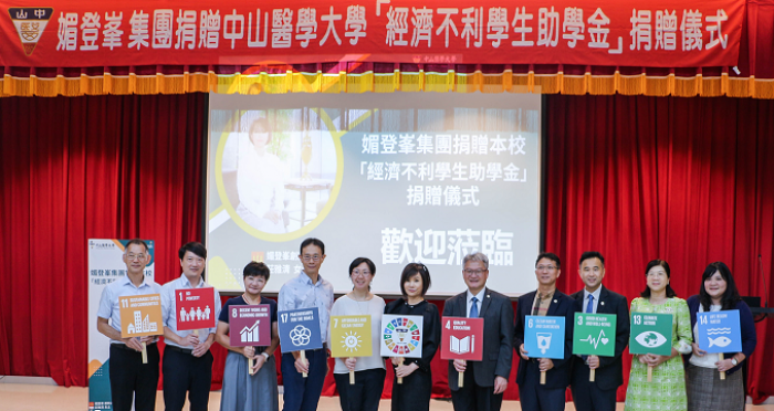 中山醫學大學與媚登峯集團創辦人兼董事長莊雅清女士,22日上午假「誠愛樓」會議廳舉行112學年度捐贈經濟不利學生助學金儀式。莊雅清女士以自身成長經歷,為了提升台灣的醫療品質,深知經濟困頓對學習造成的不便與障礙,體恤發心協助經濟不利學子在求學階段無後顧之憂專心就學,認真讀書,以後進入社會為台灣醫療產業貢獻。自111年起,媚登峯集團每年捐贈中山醫學大學100萬元,連續六年,積極協助經濟不利學生提升學習成效,充分體現企業達成永續發展與社會責任。