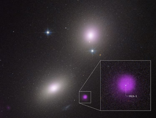 哈伯太空望遠鏡與錢德拉X光天文台觀測到的NGC 6099星系,放大影像顯示中等質量黑洞候選者HLX-1所發出的X光。照:美國太空總署NASA提供
