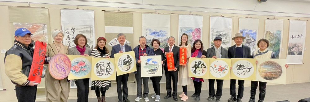藝術家展示現場揮毫與作畫示範的成果,左起:杜正雄、胡翡翠、簡品淑、吳淑真、曾鴻鍊執行董事、李沃源首席顧問、蕭采縈、唐彥博校長、姚采穎、郭香玲、趙文雄、葉傑生、陳能梨。照:聖約翰科技大學提供