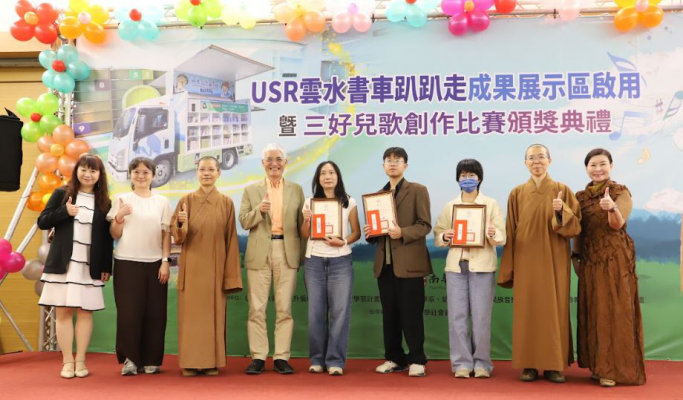 南華大學舉辦「USR雲水書車趴趴走成果展示區啟用暨三好兒歌創作比賽頒獎典禮」,三好兒歌前三名得獎者接受表揚,並與貴賓合影。照:南華大學提供