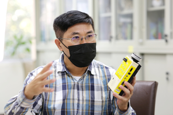 嘉大森林暨自然資源學系劉建男副教授說明如何利用蝙蝠超音波偵測器調查蝙蝠種類。。照:嘉義大學提供
