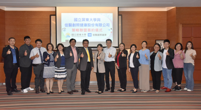 出席簽約儀式的有佳醫蘇秀鑾總經理、資訊處林一鳴處長、人力資源處莊碧芳處長、李彩綾副處長、王素真組長、李宜靜專員、吳佳芸專員、姚鈞偉專員,以及屏大陳永森校長、黃名義主任秘書、吳聲毅研發長、大武山學院黃玉枝院長、正向老化研究推廣中心劉素芬主任、AI數位轉型研究中心黃鎮淇執行長、體育室紀恩成組長等。雙方希望透過此次的產學合作,能夠創造雙贏的局面,讓屏東大學與佳醫創照健康股份有限公司共同成長,共同並為社會貢獻。