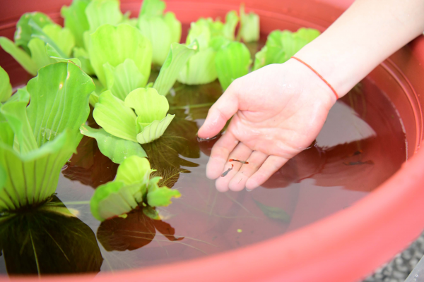 屏科大近年力行推動生物防治友善農法,注重環境生態健康,本次贈與泰安國小的生態養殖盆以食蚊及水質穩定為兩大特色進行盆中生物投放設計,如孔雀魚、紅球食蚊特性,水中孓孓為主要魚類的蛋白質來源,米蝦及底棲清道夫則會食用殘餌等,具穩定水質的功用,搭配符合觀賞魚類口徑的教學實習研發飼料,補充動物其他的營養來源。而水芙蓉在生態養殖盆更是扮演重要的角色,可透過吸收魚類排泄物分解而來的含氮、磷等營養鹽生長,而發揮淨化水質的功效,更可藉由光合作用吸收水中的二氧化及碳釋放氧氣,供動物生長所需,同時,亦能在盆中形成掩護幼魚的避難所,營造良好生態復育環境。