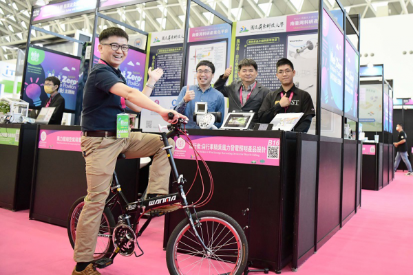 (左起)屏科大汪銘峯研究員、王星萌研究員、徐敏恭研究員團隊以「自行車騎乘風力發電照明產品設計」參展。照:屏東科技大學提供
