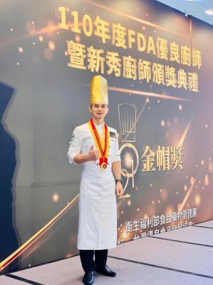 崑大企管所王昱翔榮獲110年度FDA優良廚師暨新秀廚師「金帽獎」殊榮 。照:崑山科大提供