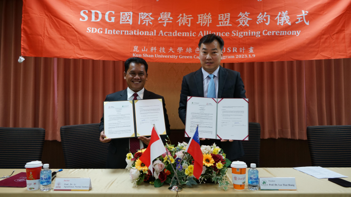 崑山科技大學持續拓展國際交流的廣度,本月9日印尼塔魯瑪迦大學(UNTAR)來訪,雙方舉行「SDG國際學術聯盟簽約儀式」,李天祥校長UNTAR Agustinus Purna Irawan校長與針對綠色關懷等大學社會責任(USR)議題進行交流與合作,期能透過技術會友,促進國際交流。當天並持續為學術交流續簽姐妹校,加強雙方合作深度。