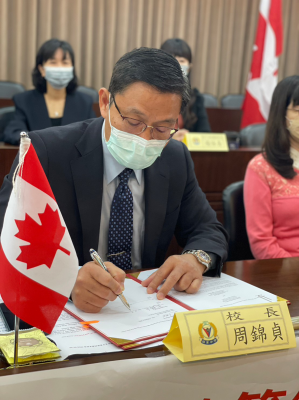 臺中嶺東中學周錦貞校長簽署合約,臺加高中雙聯學制正式啟動。照:嶺東科技大學提供