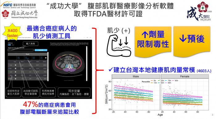 部份癌友會利用部電腦斷層來追蹤病況,以患者既有之腹部電腦斷層影像是最適合的癌症肌少診斷方法。目前癌友被診斷為肌少,多由醫師主觀判斷。「成功大學 腹部電腦斷層身體組成定量系統」軟體,預估約有35%癌症病友被精準量化有無肌少發生。