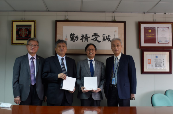 中山醫學大學 周明勇董事長(右1)、黃建寧校長(左1)、日本九州齒科大學 西原達次理事長兼校長(右2)、庄野庸雄教授(左2)。照:中山醫學大學提供