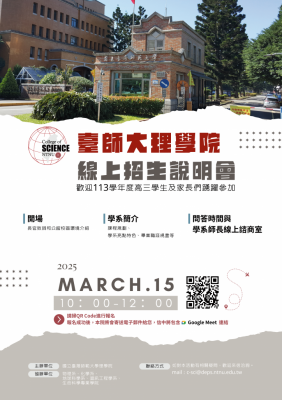 為幫助同學與家長深入了解台師大的各系所與申請流程,台師大將於3月15日(六)上午10點至中午12點,舉辦線上說明會(報名截止日:3月13日中午12:00止),並設有五個理工學院系所的聯合說明,現場將會解答所有與選填志願、申請入學相關的問題。同學和家長可藉此機會提問,獲得更多有關學系資訊及入學流程的詳解(報名連結:https://forms.gle/Bw8H2TTiiyWA4qhu5)。此次說明會也特別開放家長參與,幫助家長了解如何支持孩子做出適合的選擇。台師大期待與大家一起為未來的學業生涯奠定堅實的基礎。