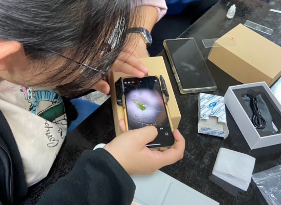 嘉藥藥學系學生用手機顯微鏡細心觀察植物組織構造。照:嘉南藥理大學提供