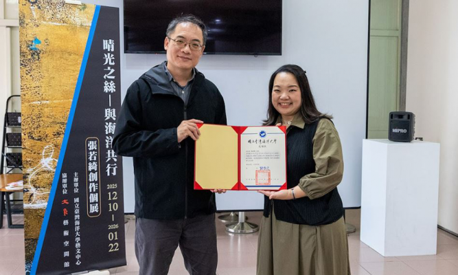 海大藝文中心謝忠恆主任頒發感謝狀予藝術家張若綺。照:國立臺灣海洋大學提供