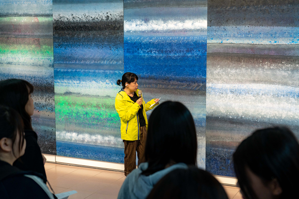 海大李明安副校長表示,藝文活動是學校推動文化永續與人文教育的重要基石,透過藝術創作讓校園更具文化厚度與美感素養,期望串聯基隆地方故事,深化師生對海洋文化與永續精神的理解,並感謝藝術家以創作詮釋「愛與和平」,為校園注入溫暖與啟發。藝文中心主任謝忠恆也指出,陳怡君老師自動性潑灑與渲染的虛實流動線條肌理,堆疊出豐厚的色層打造心靈的「虹海」意象,讓觀者從畫中感受色彩實驗「虹」的歷程。