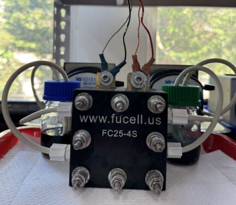 郭俞麟特聘教授帶領團隊,利用電漿技術研發出一款釩液流電池,圖為該款電池。照:國立臺灣科技大學提供
